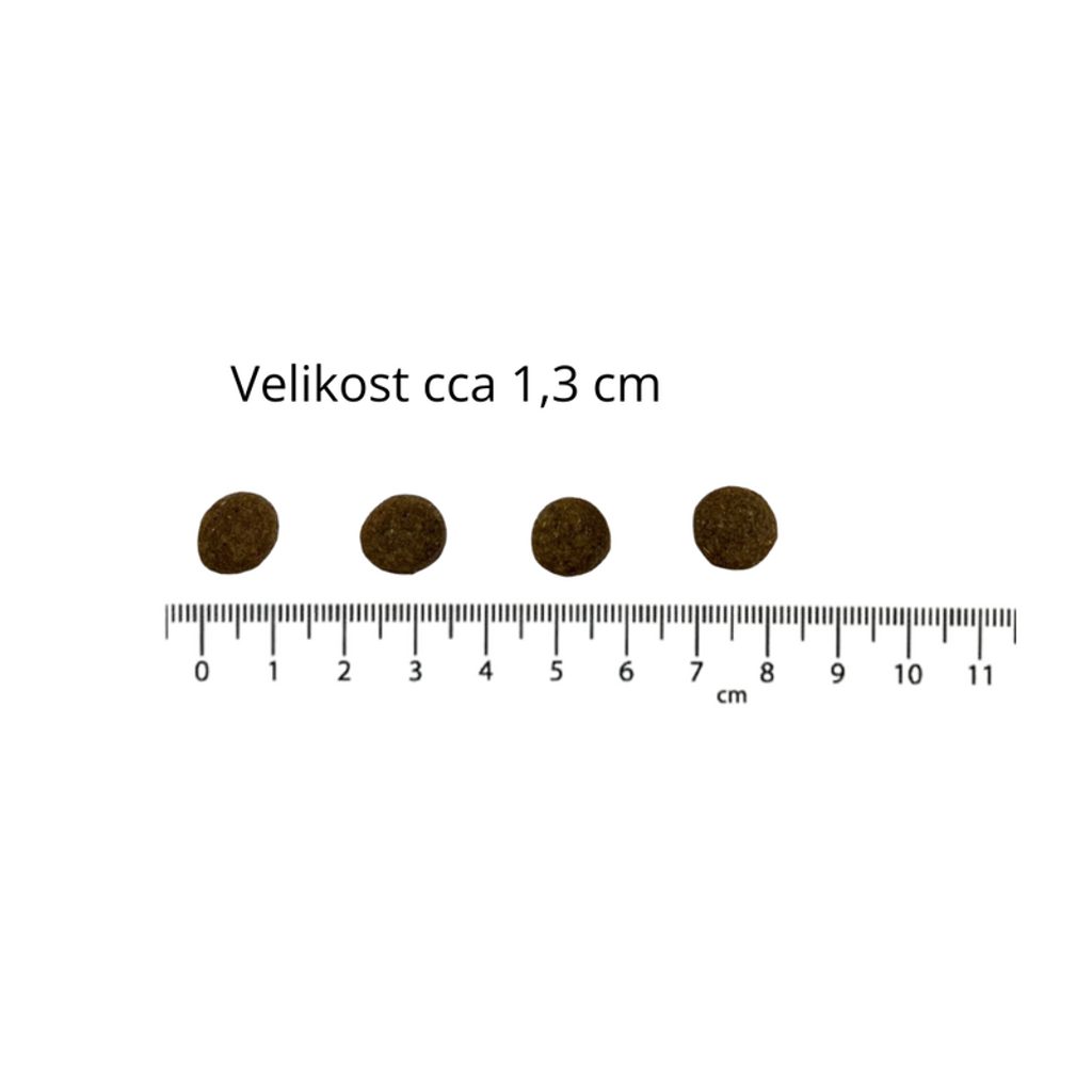 Hrubý protein 26 %, obsah tuku 15 %, vlhkost 10 %, hrubý popel 7 %, hrubá vláknina 2,2 %, vápník 1,5 %, fosfor 1,1 %, Omega-3 0,2 %, Omega-6 1,7 %.