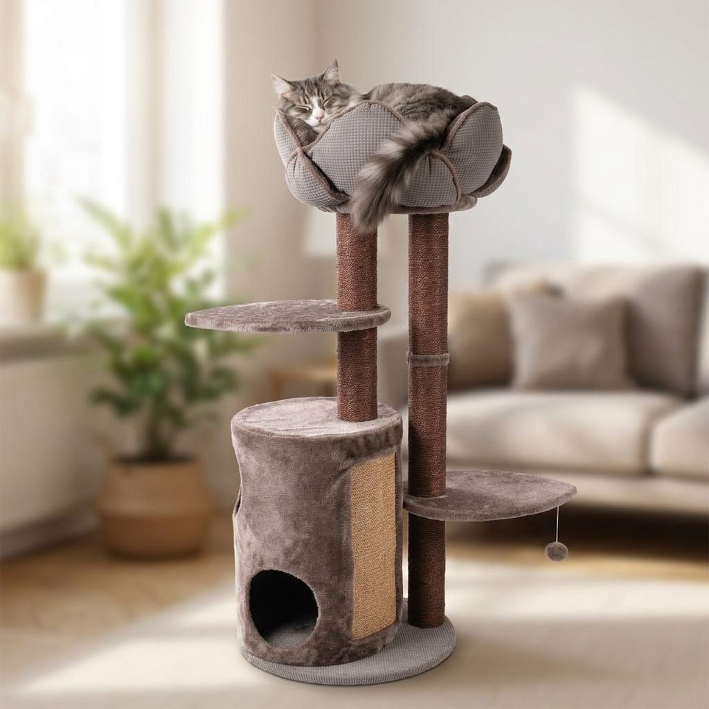 Flamingo škrabadlo Lotus Brown je stylové a odolné škrabadlo pro kočky. Polstrované plošiny a úkryty poskytují pohodlné místo k odpočinku, zatímco sisalové škrabací sloupky podporují přirozené škrabací instinkty. Součástí je také hračka pro hodiny zábavy.