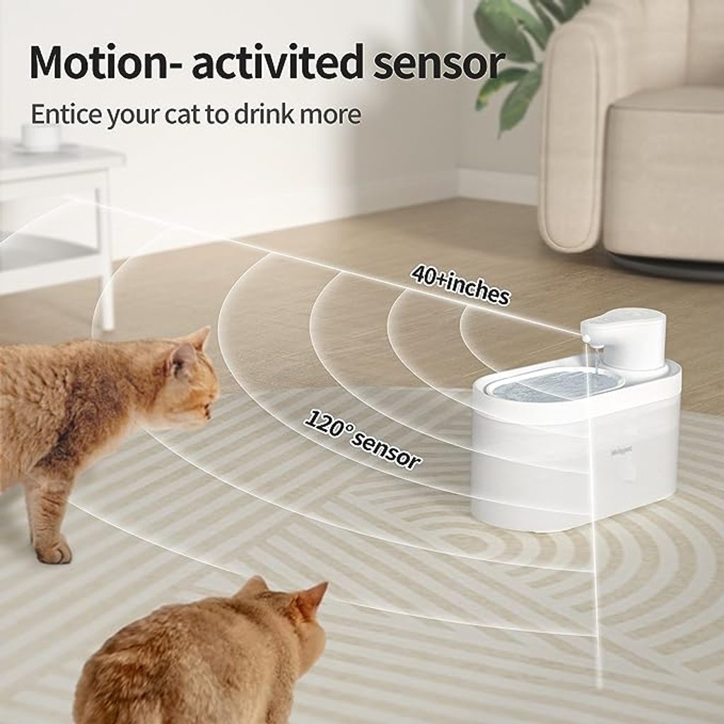 Fontána Patpet pro domácí mazlíčky s objemem 2,5 litrů je skvělým a chytrým pomocníkem pro vaši domácnost. Revoluční řešení zajišťuje šetření energie. Fontána se tak spouští pouze, pokud se k ní váš čtyřnohý mazlíček přiblíží. Naopak se vypne, když zvíře odejde. Chytrou fontánu můžete používat bezdrátově i zapojenou do sítě. A co víc, je pohodlně tichá, funguje s 35 dB, což bývá důvodem, proč ji kočky důvěřují a oblíbí si ji.
