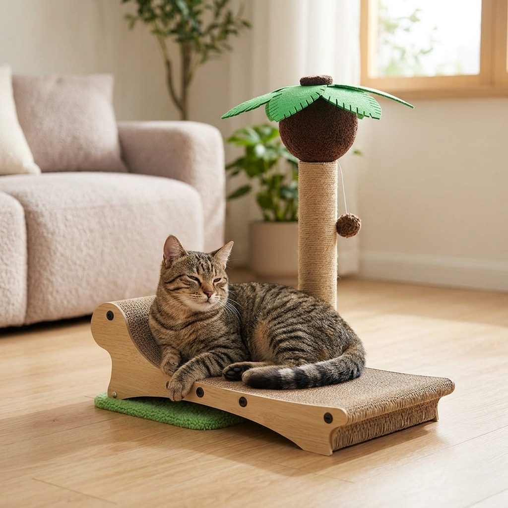 Krásné škrabadlo pro kočky ve tvaru kokosové palmy poskytuje mnoho možností zábavy. Vaše kočička může strom škrábat, šplhat na něj nebo si hrát se závěsnými kuličkami, které vydávají zvuk a o to více přitahují kočičí zájem. Zároveň slouží jako příjemné odpočívadlo. Vyrobeno ze sisalu a odolné vlnité lepenky, kterou kočička ráda škrábe. Toto škrabadlo zároveň ochrání váš nábytek, protože škrabací instinkt je všem kočičkám společný.