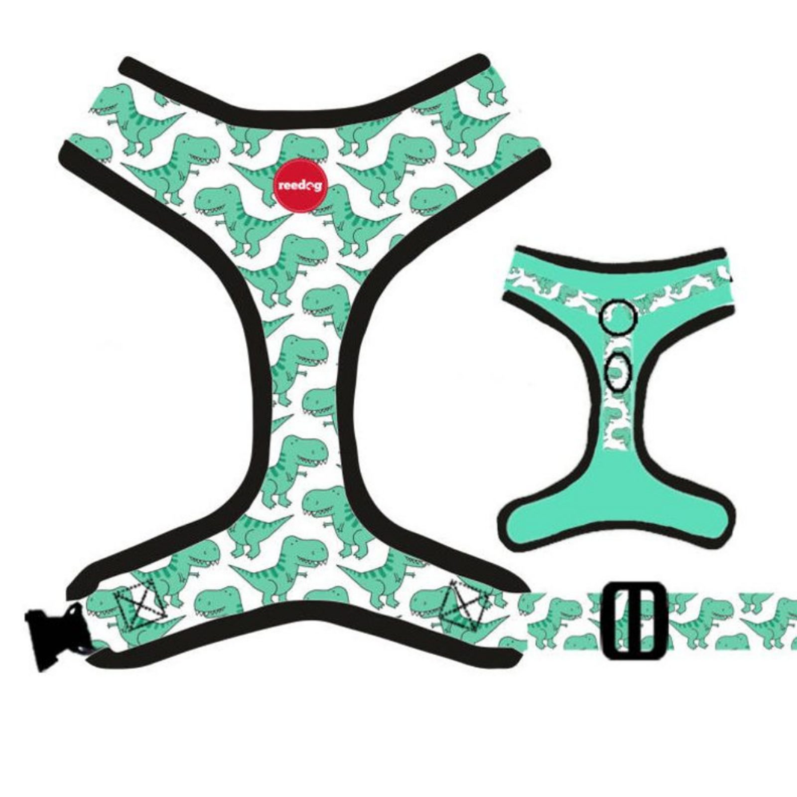 Designový postroj pro psa, model s motivem dinosaura z lehkého a prodyšného materiálů a logem Reedog na hrudní části postroje. Pohodlný střih a provedení, netrhá srst, netlačí a nedře vašeho mazlíčka, je vhodnou variantou pro pejsky kteří táhnout, aby nebyla zatěžována krční páteř. Součástí je kroužek pro uchycení vodítka.