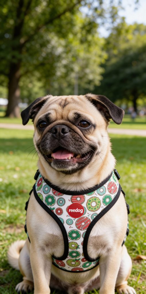 Designový postroj pro psa, model s motivem donutu z lehkého a prodyšného materiálů a logem Reedog na hrudní části postroje. Pohodlný střih a provedení, netrhá srst, netlačí a nedře vašeho mazlíčka, je vhodnou variantou pro pejsky kteří táhnout, aby nebyla zatěžována krční páteř. Součástí je kroužek pro uchycení vodítka.